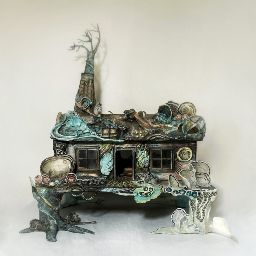I love building my houses from repurposed materials but I think painting them has become my favorite part of the process. I’ve missed painting. I find myself feeling frustrated when I attempt painting on traditional flat painting substrates like canvas and wood but I love painting these weird 3D paper and found materials structures. I’m enjoying exploring form and color unburdened by narrative. Weird, right! Who am I?